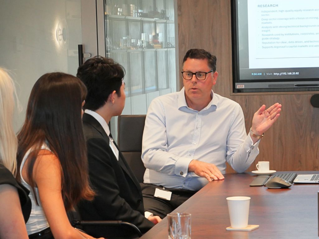在董事会会议室,Argonaut 的首席执行官兼企业融资主管 Greg Southee 致欢迎辞,概述了公司的历史和在自然资源领域的专长。随后,学生们与团队成员一起参加了每日晨会,深入了解了整个业务团队如何通力合作,为客户带来最佳创意。.